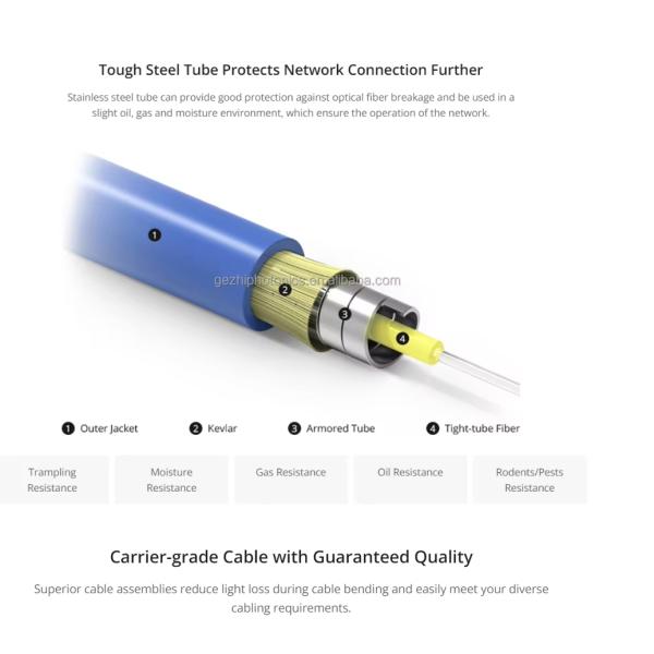 Armored fiber optic cable with build-in metal armor can provide stronger protection of the optical fibers than standards fiber optic cables. The rugged armored cables allow optical fiber to be installed in the most hazardous areas, including environments with slight dust, oil, gas, moisture, or even damage-causing rodents and pests.